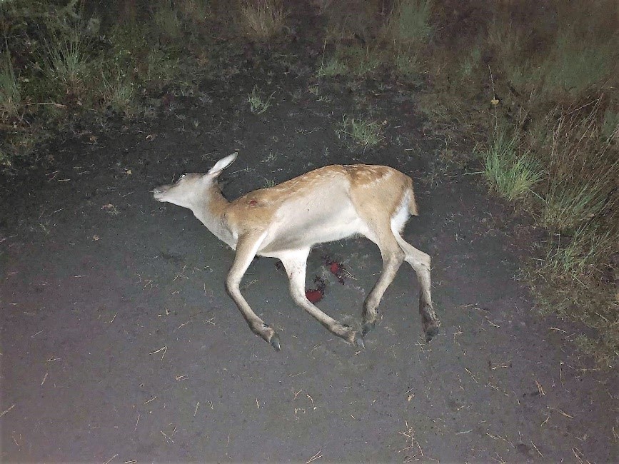 Opgelucht zie ik lichten in het bos opdoemen, R. nadert met zijn auto. Ik pak het kalf bij de voorlopers en begin het alvast naar het pad te slepen. Het valt niet mee, het is -nog niet ontweid- een best gewicht. Regelmatig verwissel ik van schouder.
