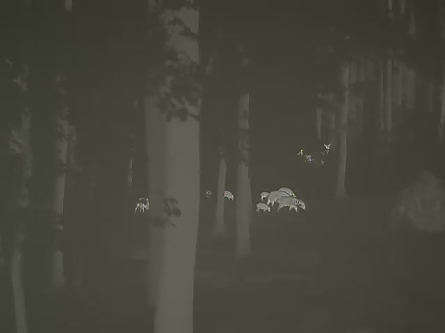 Er komt een hinde met een kalf uit de dekking, afstand nog ruim 150 meter. De hinde blijft regelmatig staan om te kunnen zekeren. Maar ze komt niet door en kijkt regelmatig achterom. Half achter wat lage sparren blijft het duo staan. Onbeweeglijk. Krijgen ze verwaaiing? Nou, even later blijkt dat ze dat vast kregen, maar het is geen verwaaiing van ons. Opeens lopen er biggen onder de voerbak, even later gevolgd door vier grotere varkens. Zo loopt er rond de bak een rotte van zo’n, 15 stuks zwartwild, meest biggen. Onder de bak ligt kennelijk niet veel, want langzaam trekken ze verder.